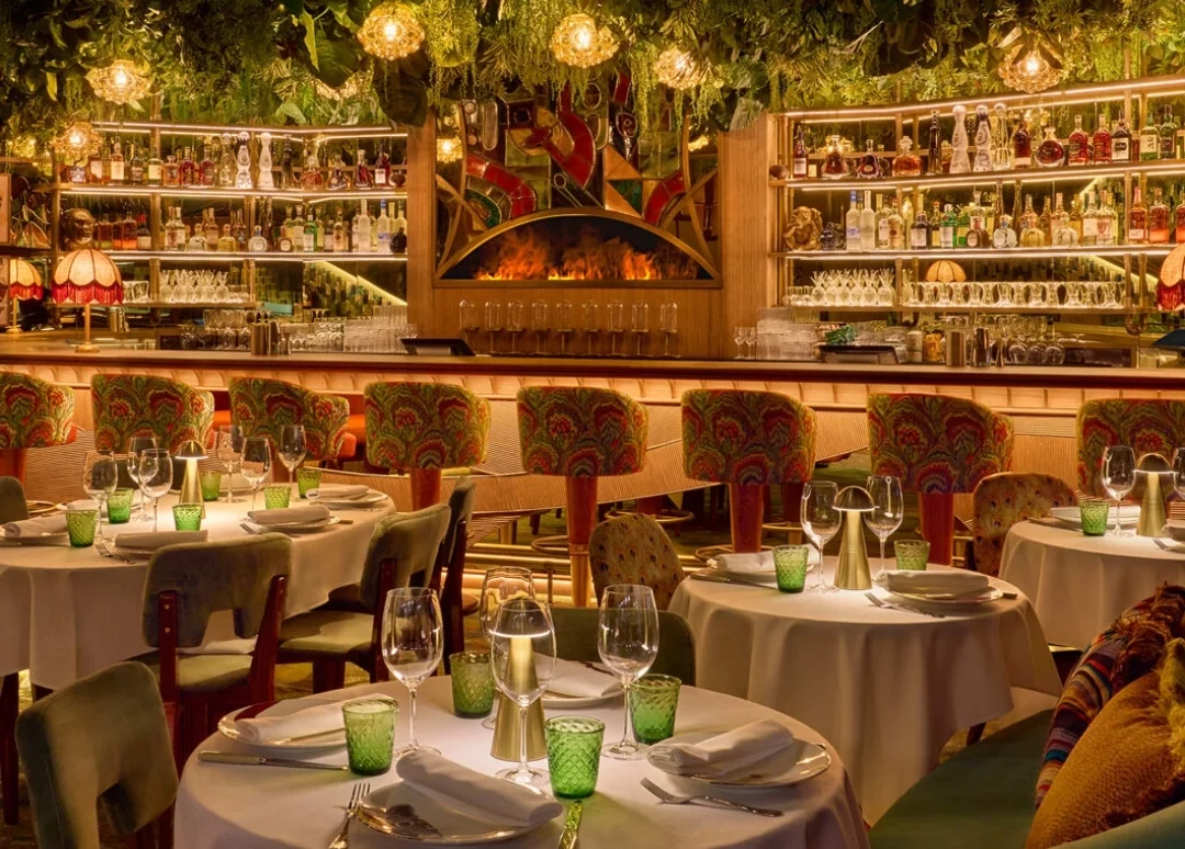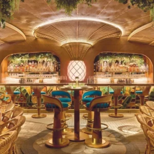 Uno de los elementos más llamativos es el mural cerámico artesanal diseñado para presidir la zona de coctelería. Con motivos orgánicos y colores intensos, la pieza se integra de manera natural en el ambiente, sumando carácter y profundidad al conjunto.