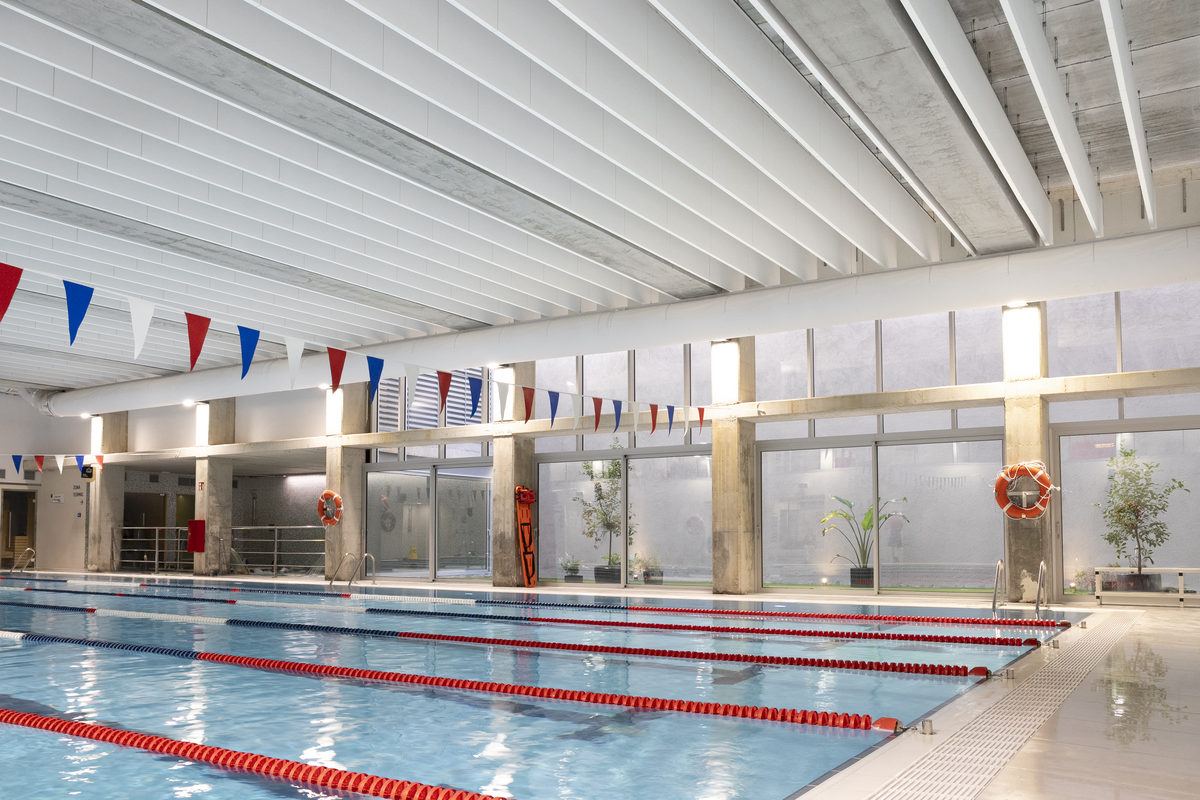 En este contexto, la piscina -el espacio en el que Saint-Gobain Ecophon intervino con su solución acústica- representaba el mayor desafío. Su gran volumen, la altura del recinto y la presencia de superficies duras y resistentes a la humedad, como el hormigón, generaban un nivel de reverberación especialmente elevado. Esto hacía imprescindible incorporar un tratamiento acústico eficaz, capaz de mejorar el confort sonoro sin alterar la estética del espacio.