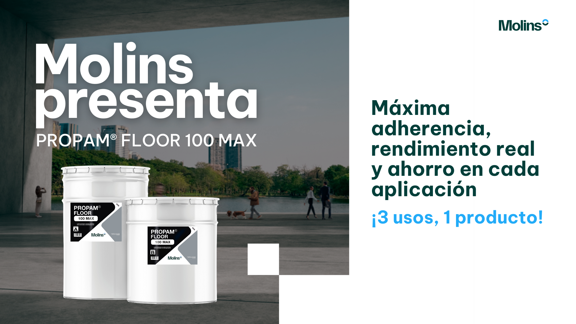 El negocio Construction Solutions de Molins, referente en soluciones para la construcción, ha lanzado PROPAM® FLOOR 100 MAX, una solución 3 en 1 diseñada para proteger la salud de los profesionales y garantizar pavimentos duraderos gracias a su tecnología epoxi 100% sólidos, de baja viscosidad y con bajas emisiones.