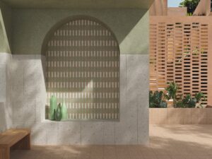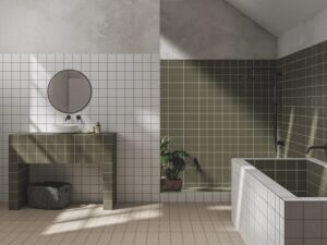 Por último, Vibe introduce una dimensión gráfica y decorativa en formato 15×15 cm en porcelánico, combinando bases cromáticas con piezas de motivos simétricos y ornamentos estilizados. Sus composiciones florales suavizadas y trazos delicados evocan una sensibilidad mediterránea reinterpretada desde una mirada contemporánea.