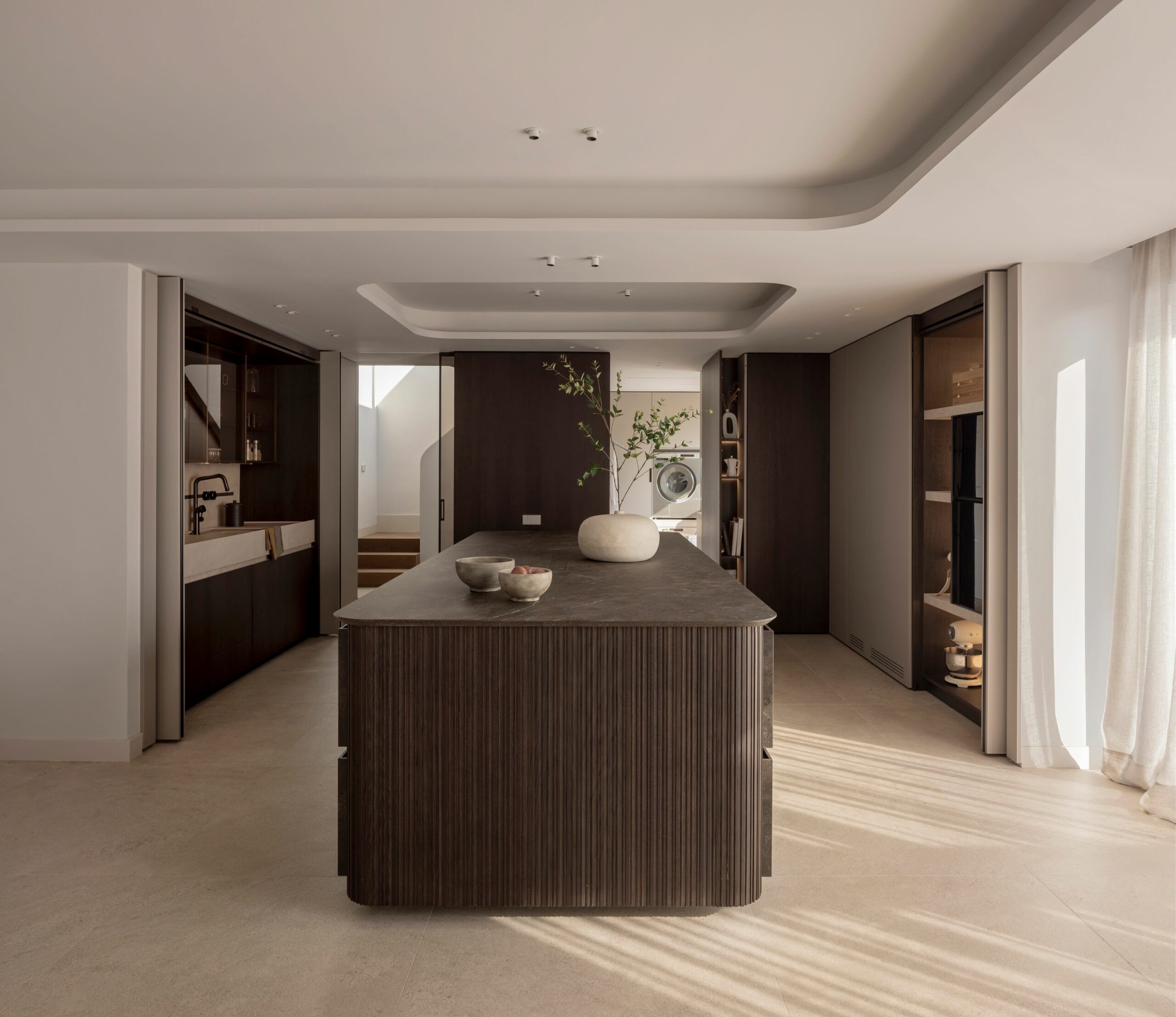 Las curvas articulan el espacio con naturalidad, uniendo la cocina y las áreas adyacentes mediante un trazado continuo y equilibrado. Su forma suaviza la geometría, aporta líneas limpias y ordenadas, y suma un carácter orgánico que equilibra la precisión del diseño.