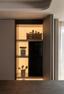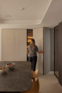 Un sistema de puertas escamoteables permite controlar la presencia de la cocina: se oculta cuando el espacio se dedica a socializar y se muestra cuando el ritual culinario reclama protagonismo. Orden, serenidad y belleza… a voluntad.