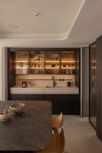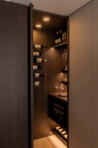 En el punto de encuentro entre ambos lados de la cocina, se abre un wine cabinet para los amantes del vino: un espacio que acompaña el gesto de servir, brindar y disfrutar, equipado con una vinoteca Dunavox.