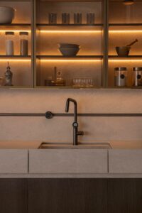 El fregadero integrado, junto al grifo Vita de GESSI, dialoga con la arquitectura del MDi y refuerza la idea de que en GINA35 cada detalle está pensado para elevar la funcionalidad sin renunciar a la belleza.