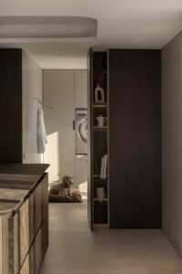 A su lado, una puerta de paso integrada da acceso al lavadero, un espacio resuelto con el mismo lenguaje material para mantener la unidad del diseño y hacer más sencilla la rutina diaria.
