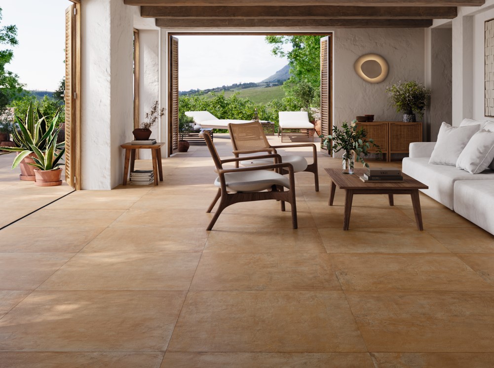 Minimalismo cálido: superficies sobrias y serenas que buscaron equilibrio y continuidad en los espacios. Piedras areniscas porcelánicas como Ribera, Riverside y Zarci, además de maderas porcelánicas como Oslo o el revestimiento Guinea, se convirtieron en la base de ambientes acogedores y contemporáneos.