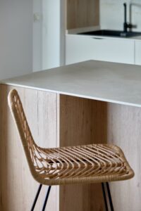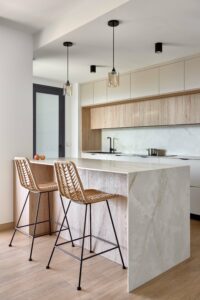 La combinación con tonalidades naturales aporta equilibrio al espacio y refuerza la serenidad que envuelve toda la cocina. Los elementos conviven en perfecta coherencia, creando una composición donde todo fluye con facilidad y cada detalle contribuye a una estética cuidada y contemporánea.