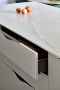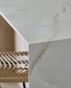 La personalidad de este material reside en su capacidad para transformar la cocina en un entorno luminoso y lleno de presencia. Un lugar donde la elegancia se percibe de manera espontánea, donde la luz se integra de forma orgánica y donde cada superficie invita a ser contemplada.