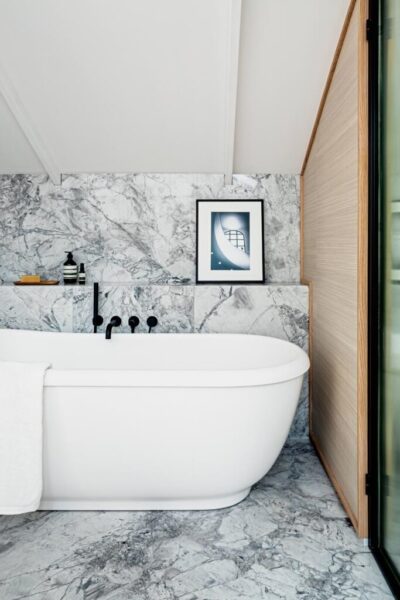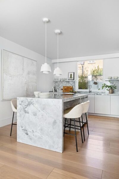 Igualmente, se ha apostado por la integración de piezas únicas diseñadas a medida por el estudio, entre ellos la mesa de comedor en microcemento pulido blanco, la isla de la cocina revestida íntegramente en piedra natural, los lavabos de los baños o las mesitas de centro en mármol veteado en tonos blancos y negros, siguiendo con las tonalidades presentes en la planta baja. El uso de materiales naturales, llenos de carácter y personalidad gracias a sus peculiares detalles, trazos y tonalidades, que los hacen únicos, son sin duda una de las señas de identidad de nuestro trabajo.