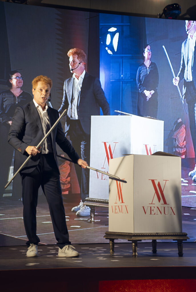 La noche continuó con un espectáculo del mago Yunke, que sorprendió al público con trucos inéditos creados especialmente para VENUX, entre ellos un número con polvo atomizado que, al verterlo al agua, parecía disolverse para después volver a emerger intacto, un guiño a la calidad de las materias primas con las que la marca conforma sus superficies de piedra sinterizada.