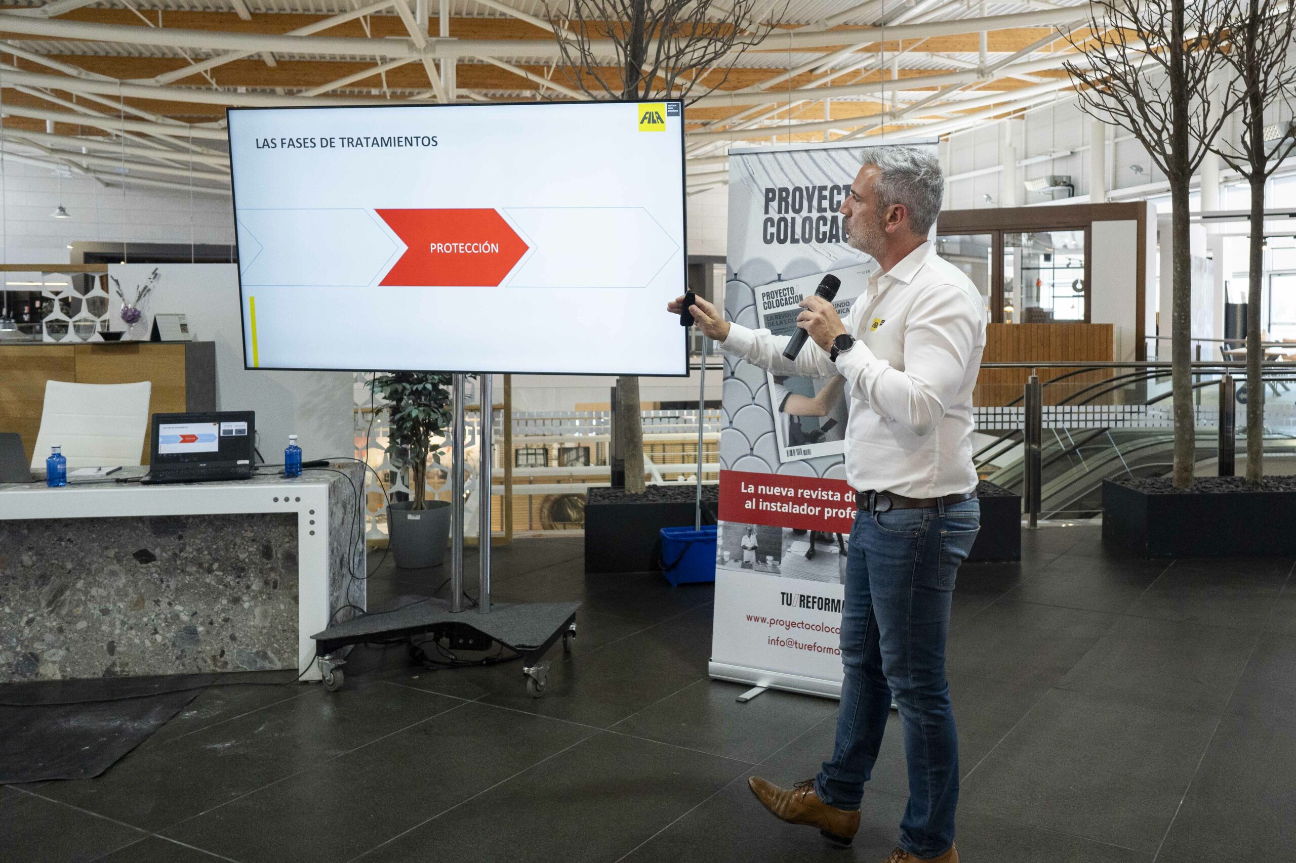 Durante la Masterclass XXL, los asistentes tuvieron la oportunidad de asistir a talleres prácticos y demostraciones sobre instalación de superficies de gran formato, combinando precisión, rapidez y técnicas innovadoras. Fila Solutions intervino mostrando sus soluciones de limpieza, protección y mantenimiento de superficies, poniendo en valor la facilidad de aplicación tras la colocación profesional de cerámica. La jornada reunió a profesionales de la reforma y la rehabilitación, y se convirtió en un espacio de intercambio de conocimientos, networking y actualización técnica.